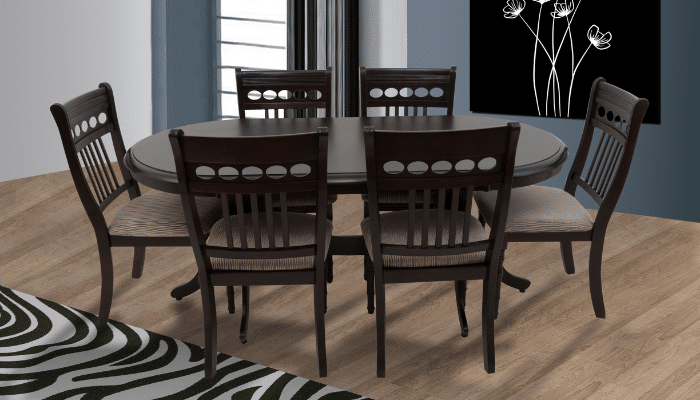 With upholstered seats and a wooden back with detailed cut-outs, this 6 seater will be a great addition to your home.